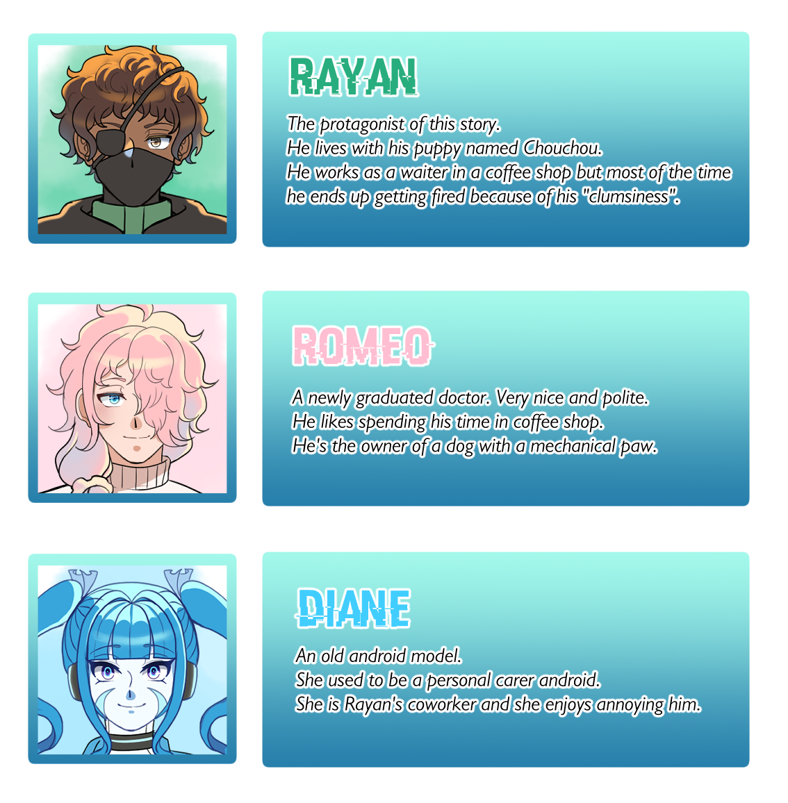 Rayan is a former soldier from Vivara who migrates to Tekrena, a highly developed country where humans and androids coexist.